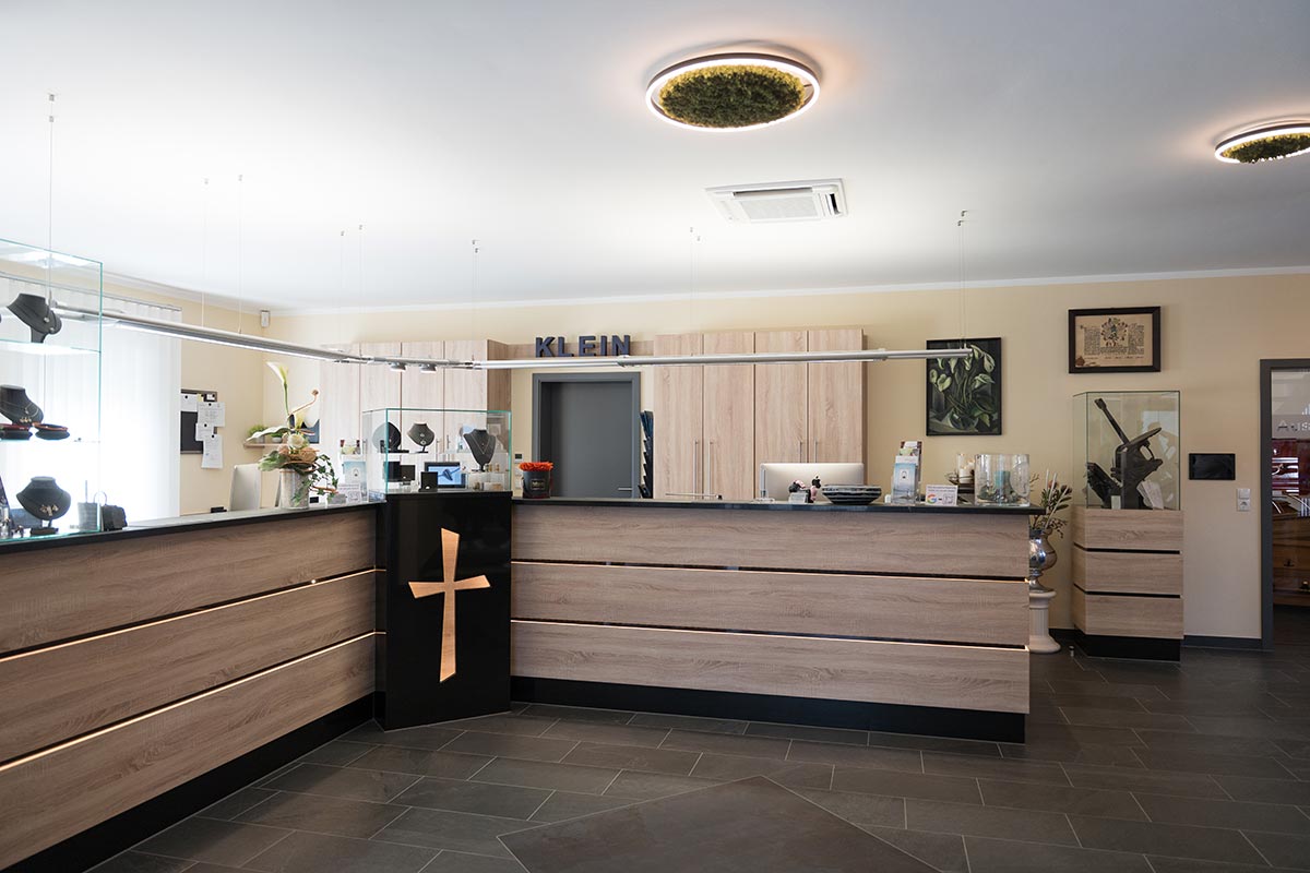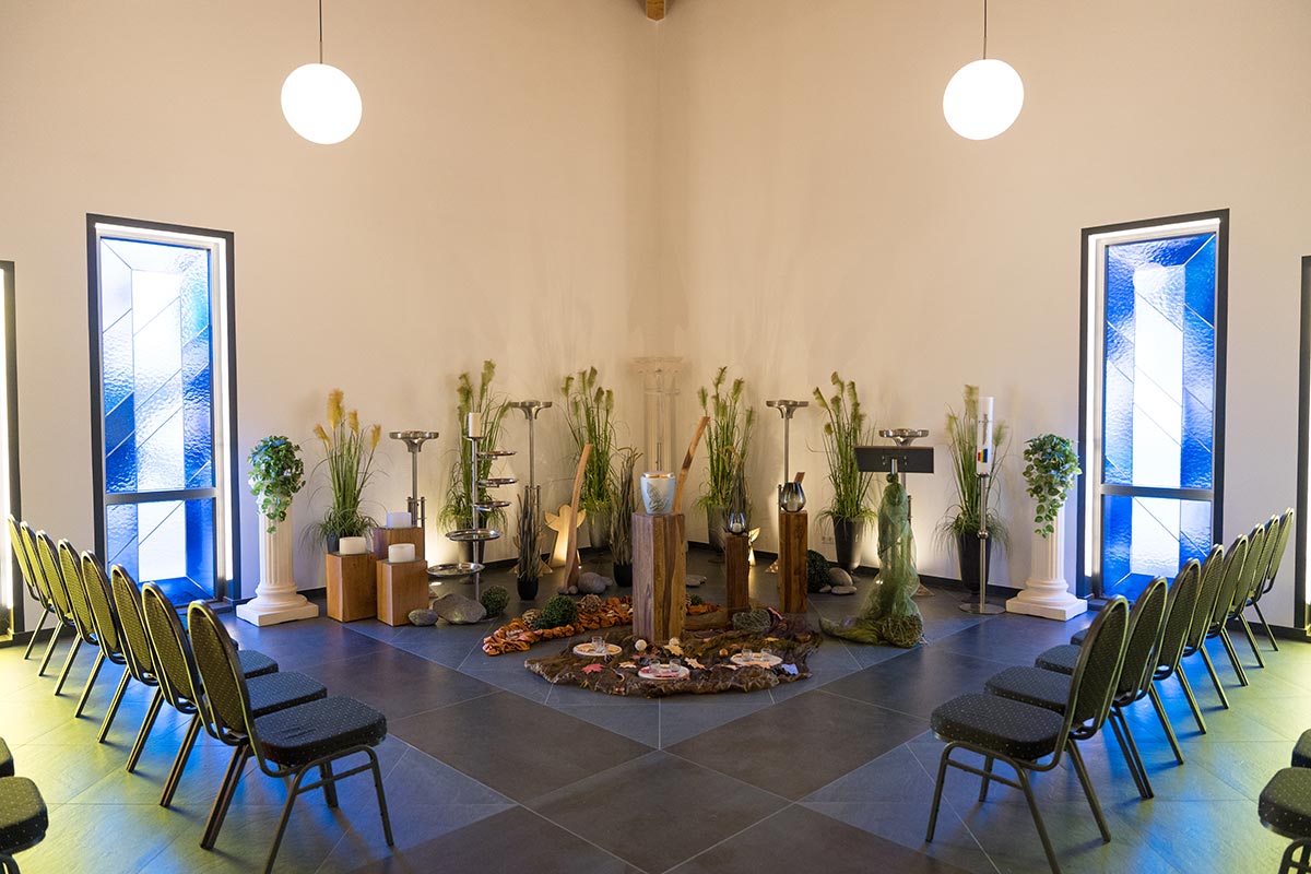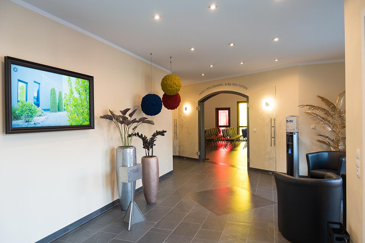 Unsere Räumlichkeiten sind so gestaltet, dass Sie in einer schweren Zeit einen Ort der Ruhe und des Vertrauens finden. Moderne Architektur, warme Farben und eine einladende Atmosphäre schaffen den passenden Rahmen für persönliche Gespräche und individuelle Abschiede.